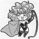 How can I describe Tira Misu? In her normal civilian outfit, Tira wears a large maroon dress which covers every aspect of her body, loose too. Furthermore, she sports large, thick glasses that resembles that of Ranma 1/2's Mousse. In her sorcerer hunter outfit, she's a completely different person! She removes the big, red dress to reveal a leather dominatrix outfit: Leather gloves, leather thigh-high boots, fishnet stockings, leather boustier, leather panties... LEATHER, LEATHER, LEATHER!!! She removes the glasses in this outfit.